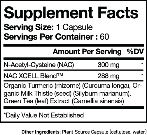 NAC XCELL™: A fusion of nature and science for your health. This potent mix includes N-Acetyl Cysteine, Milk Thistle, and Organic Turmeric, targeting liver health, respiratory function, and enhancing antioxidant defenses. A trusted choice for optimal body detoxification and immune support.