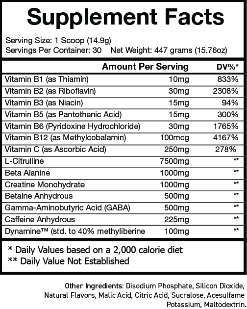For use by healthy adults only, not recommended for persons under the age of 18. Do not use if you are pregnant or nursing. Individuals should not consume other caffeinated products in conjunction with this product. Seek advice from a healthcare professional before taking if you have any preexisting medical condition to ensure it is safe to take this product. In case of accidental overdose, contact a poison control center immediately. Avoid alcohol and prescription stimulants while taking this product. Exceeding recommended serving will not improve results and may cause serious adverse health effects. Discontinue use and contact a licensed healthcare professional immediately if you experience an unusually rapid heartbeat, dizziness, severe headache, or shortness of breath.